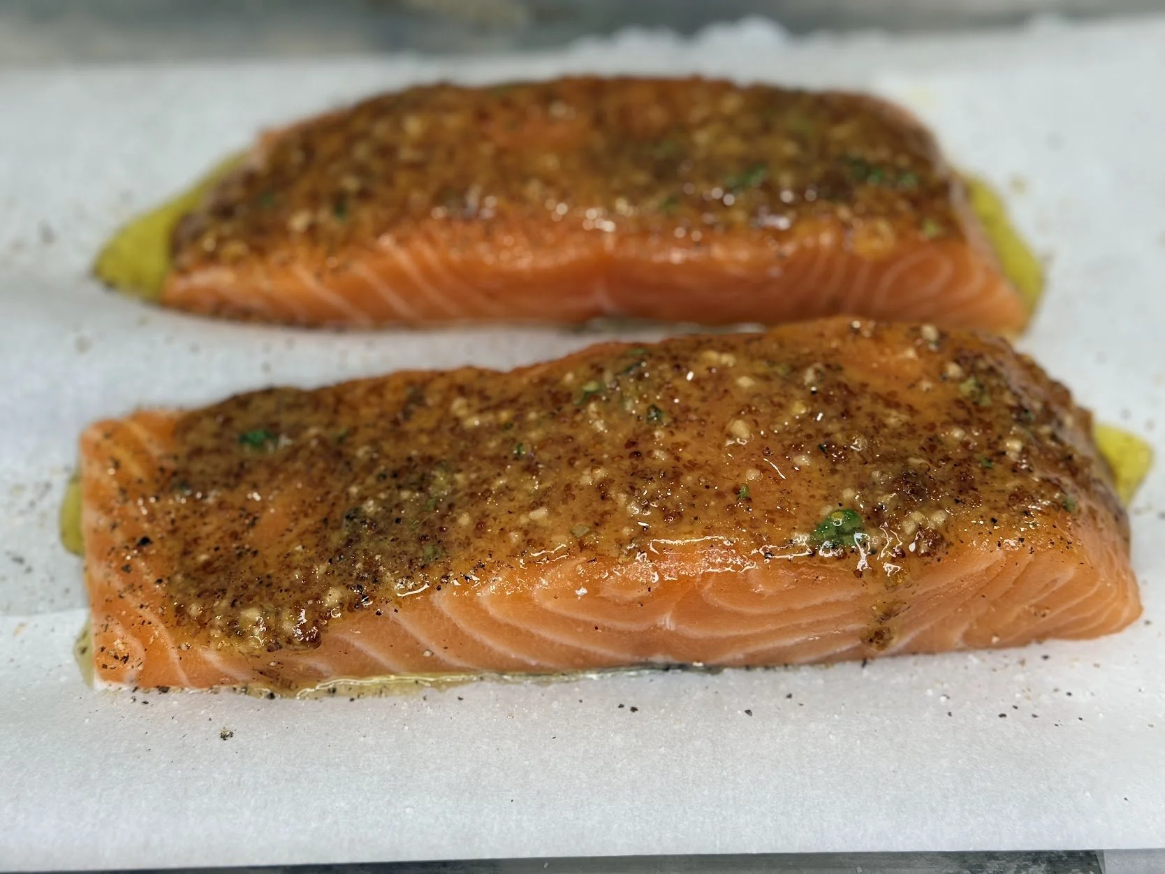 - Brush the glaze generously over the top of the salmon, reserving a small amount if you would like extra for finishing.