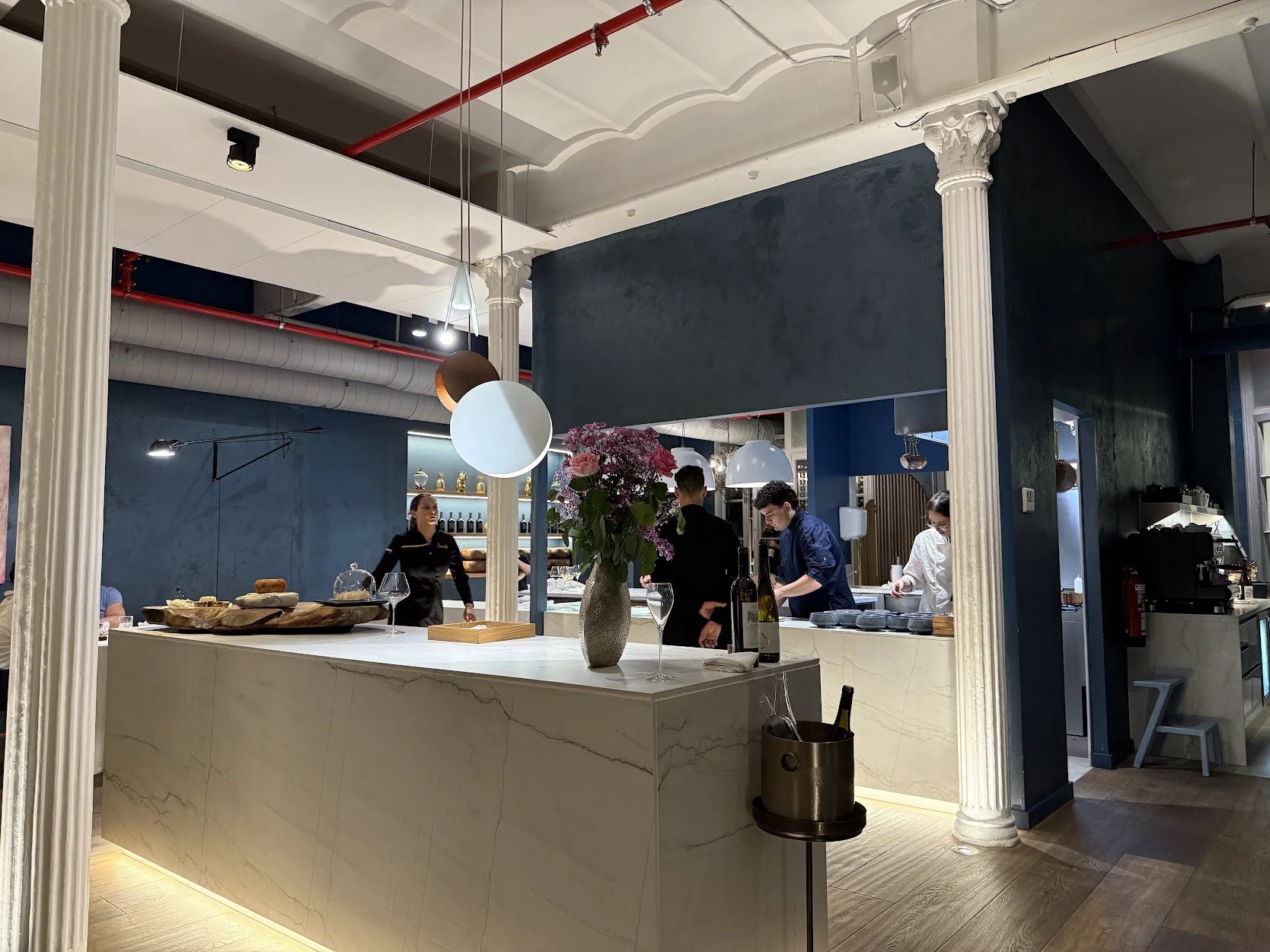 The kitchen, open to the dining room, was quiet and extremely well organized. All the dishes were served synchronized throughout the meal.