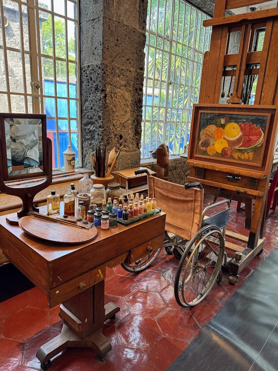 The museum offers a fascinating look at her personal history, her love for Mexican folk culture, and her unique relationship with Diego Rivera. Below is her studio where she painted while wheelchair bound, as she was much of her life.