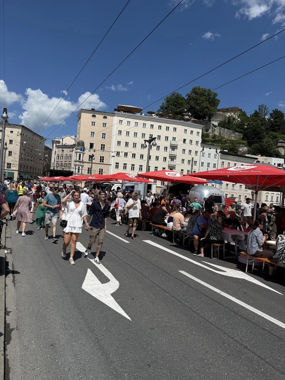 We next went into Kapitelplatz, one of Salzburg’s another one of the many squares in Salzburg. The golden sphere sculpture—called Sphaera—immediately caught our eye, with a solitary figure standing atop it, gazing out over the city. The square was preparing for an evening evet with rows of chairs being set up. Framed by the Salzburg Cathedral and the Dom Quartier, our guide shared we were into the heart of Salzburg’s historic and cultural life.